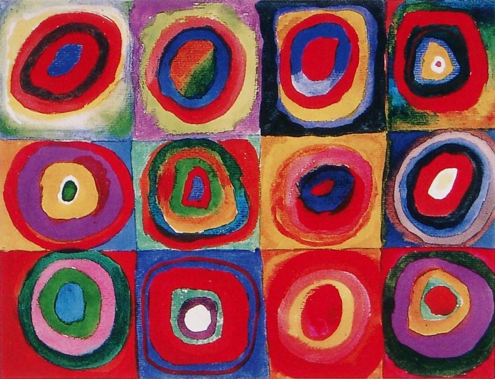 Wassily Kandinsky, Farbstudien, Quadrate mit konzentrischen Ringen, 1913, Acquarall, Gouache und schwarze Kreide auf Papier, abgedruckt in: Helmut Friedel The Blue Rider: A Dance in Colours: Watercolours, Drawings and Graphic Arts from the Lenbachhaus, Munich 2011, ISBN 9783777432717
